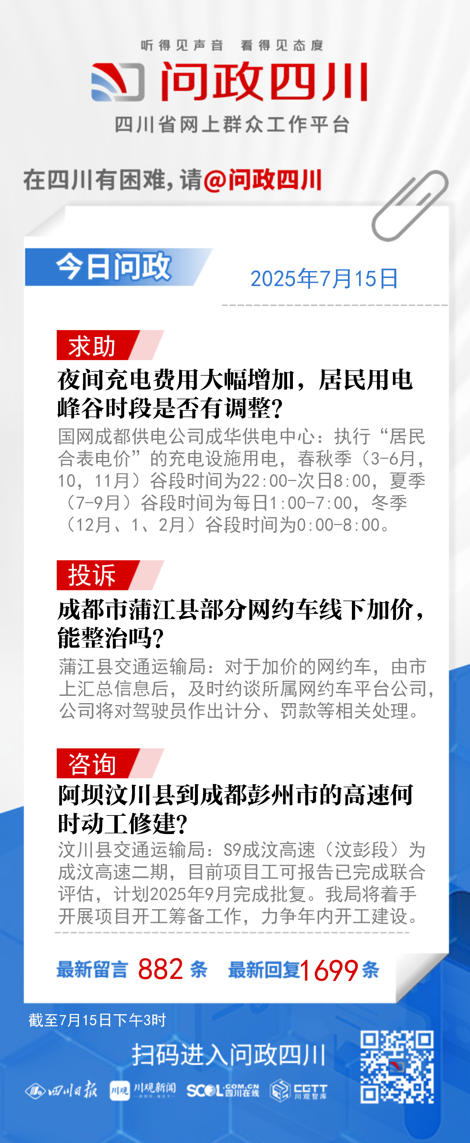 问政四川网友提问:我是成都明信鹭湾A区小区的居民,7月以后,我发现停车位自有充电桩充电的金额大幅度增加,登录国电APP查看显示,23点之后充电还是平段电费,凌晨1点以后才是谷段电费。这和我之前打听到的“夏季晚上23点以后为谷段”有出入。请问,居民用电的峰谷时间到底是如何划分的?是否有调整?