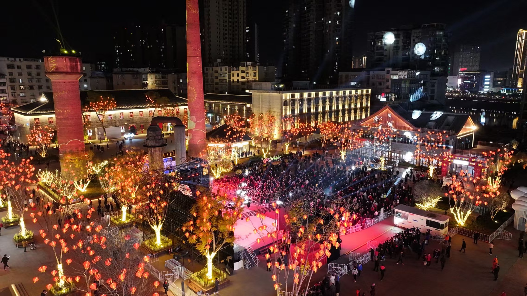 夜幕下的巴城记忆文创产业园,文艺演出吸引了众多市民参与。(巴州区委宣传部供图)