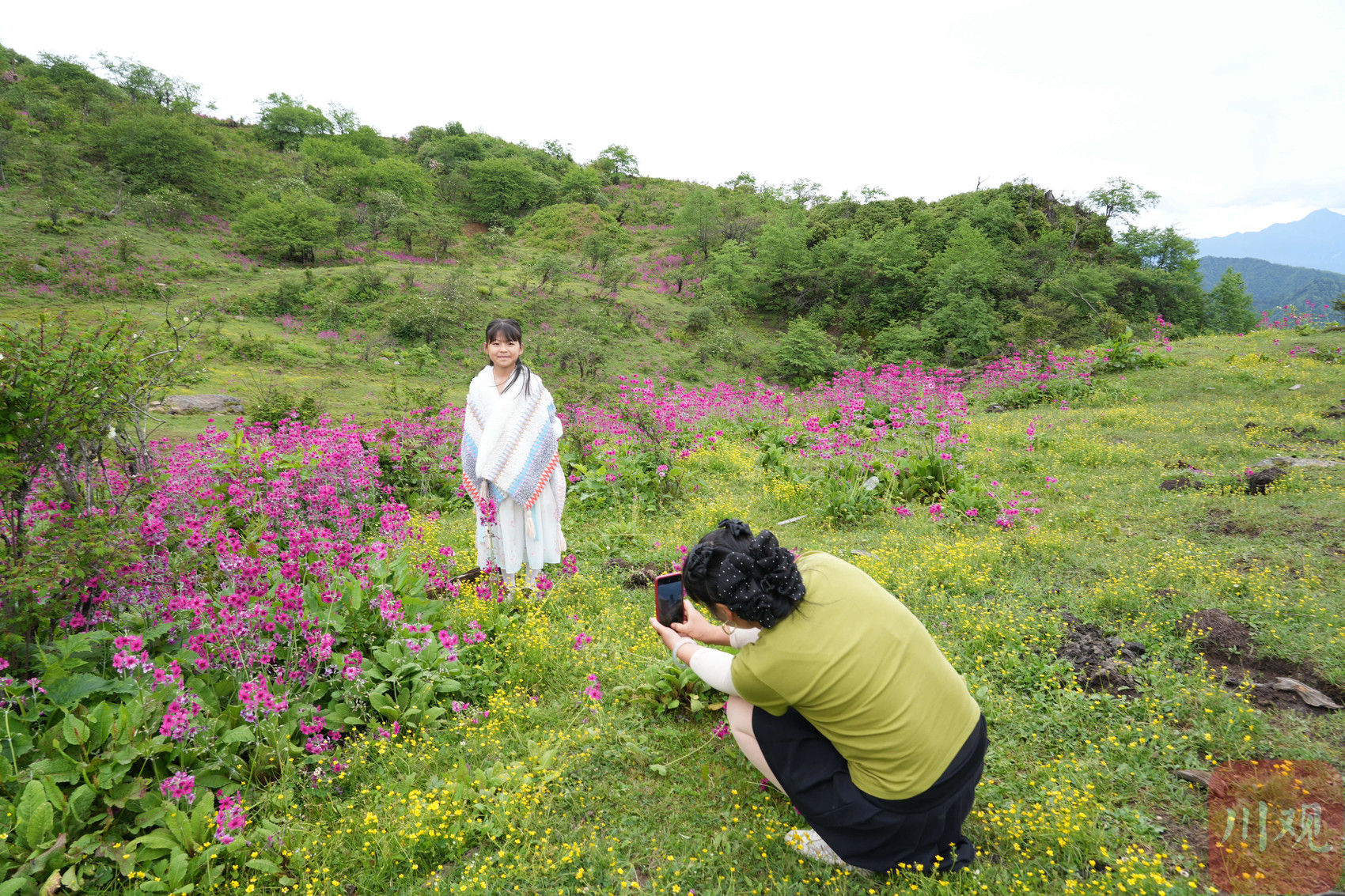 7月14日,走进泸定县牛背山村,磨盘塘的报春花和高山杜鹃争相开放,游客穿梭在花海之中,赏花拍照,怡然自得。