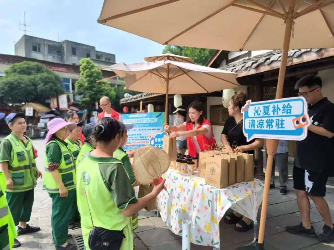 七月流火,双流区彭镇老街的青石板路被烈日炙烤得发烫,空气里弥漫着燥热的蝉鸣。往年此时,酷暑难耐往往让游客望而却步,老街商户也常经历“暑期淡季”。然而,2025年的这个夏天,老街却呈现出别样生机——一场由彭家场社区联动老街商居联盟发起的“茶沁老街·暑日送爽”行动,不仅为高温下的劳动者撑起一片“清凉天”,更意外地带“火”老街的人气与生意,让“凉”资源撬动了“热”商业,激活了“暖”经济。