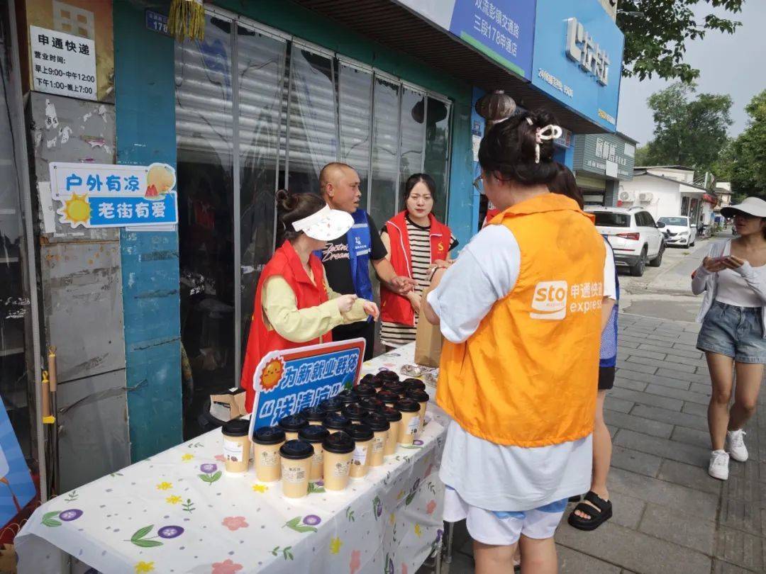 7月15日,快递小哥王师傅顶着烈日,在老街匆匆穿行,汗水浸湿了他的工服,正准备继续送货,老街上一块醒目的“夏日送清凉活动”招牌让他停下了脚步。志愿者微笑着递上一杯冰镇凉茶,“咕咚咕咚”几口下肚,沁人心脾的清爽瞬间驱散了积攒一上午的燥热。“太及时了!这大热天跑单,能喝到这么解渴的凉茶,心里也舒坦多了。”王师傅抹了把汗,脸上露出朴实的笑容。像王师傅这样奔忙在高温下的快递员、外卖小哥、网约车司机、环卫工人、保安等群体,是这次行动的重点关怀对象,一杯杯免费凉茶,传递的是老街对劳动者的敬意与关怀。