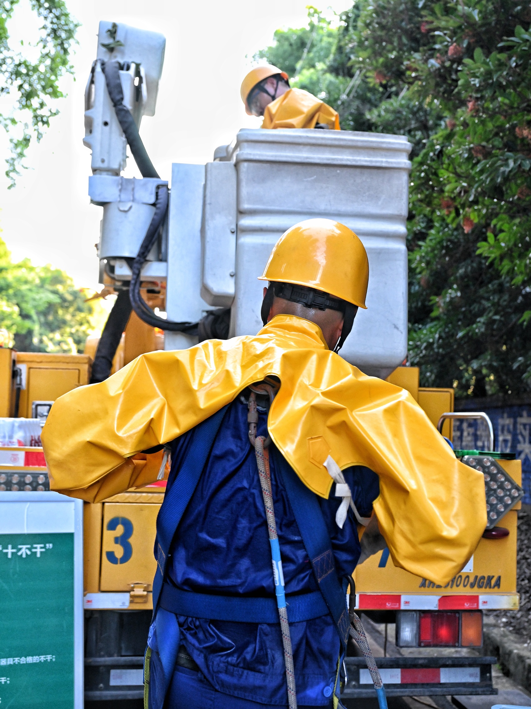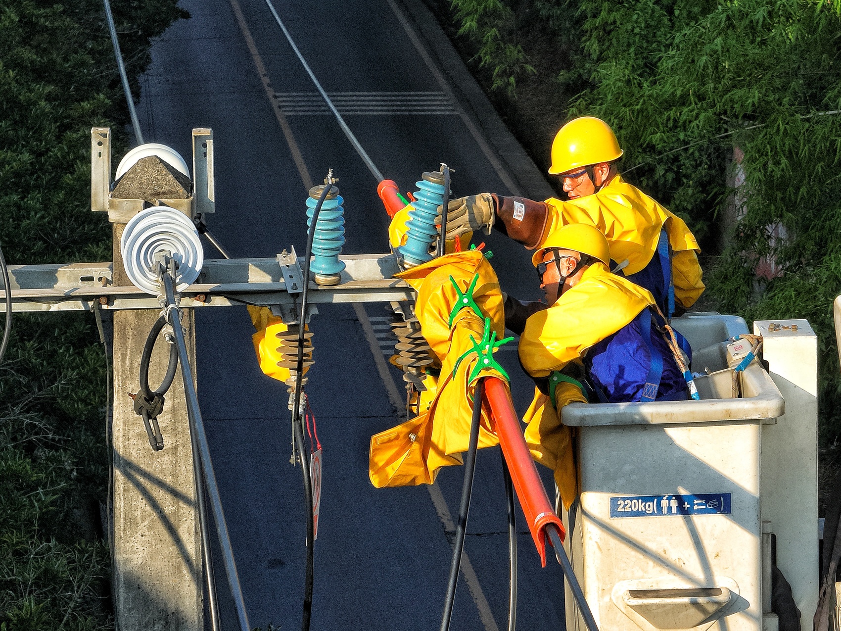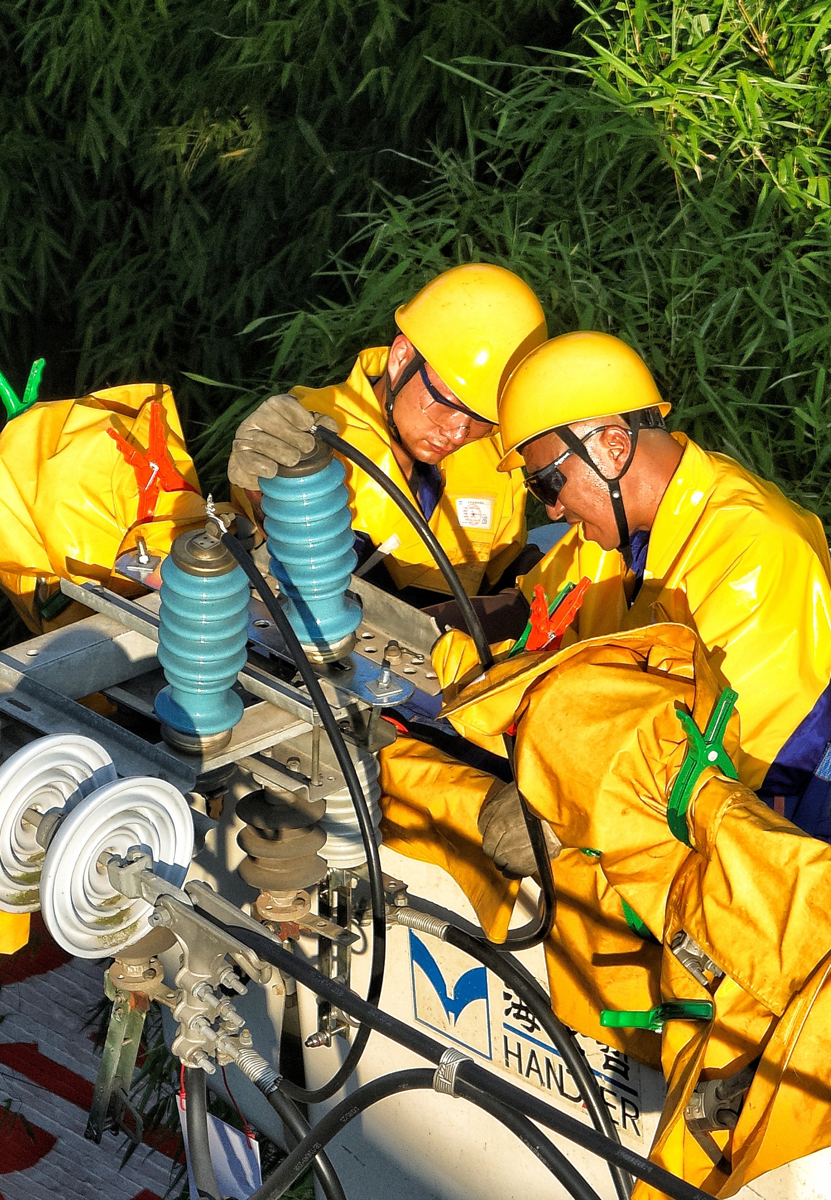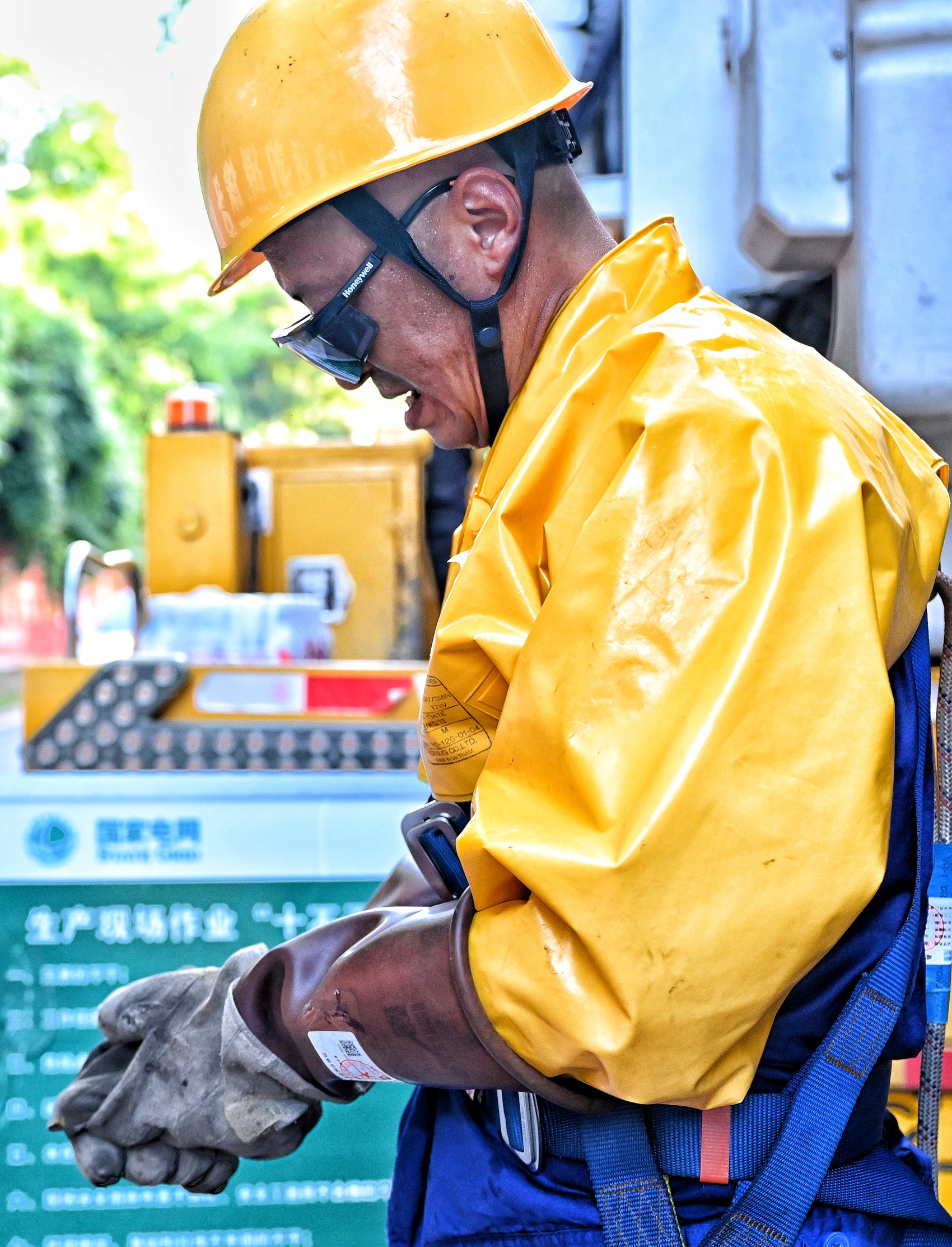 棉质蓝色工装外,套一件不透气的黄色绝缘披肩,再戴上三层防护手套,在39℃的高温下开展带电抢修,是种怎样的体验?