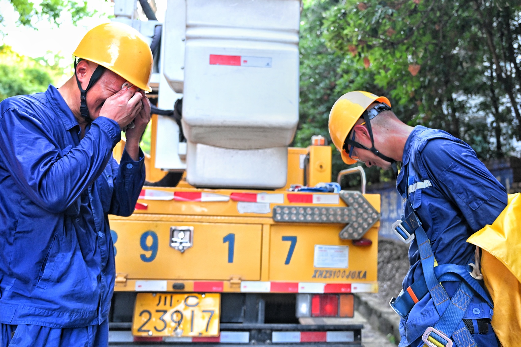 带电抢修完毕,二人已汗流浃背。袁丹 摄