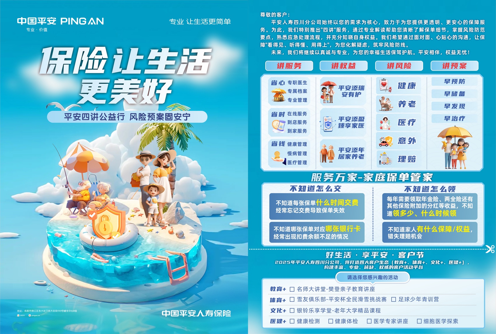 为破解这一行业痛点,平安人寿四川分公司积极响应监管部门号召,于7月至8月在全川开展“爱与责任·平安四讲进万家”活动,以简洁明了的方式,向客户普及金融知识、防控风险、优化服务体验,全方位保障客户权益,全面落实金融领域重点工作,展现金融企业的担当与责任。