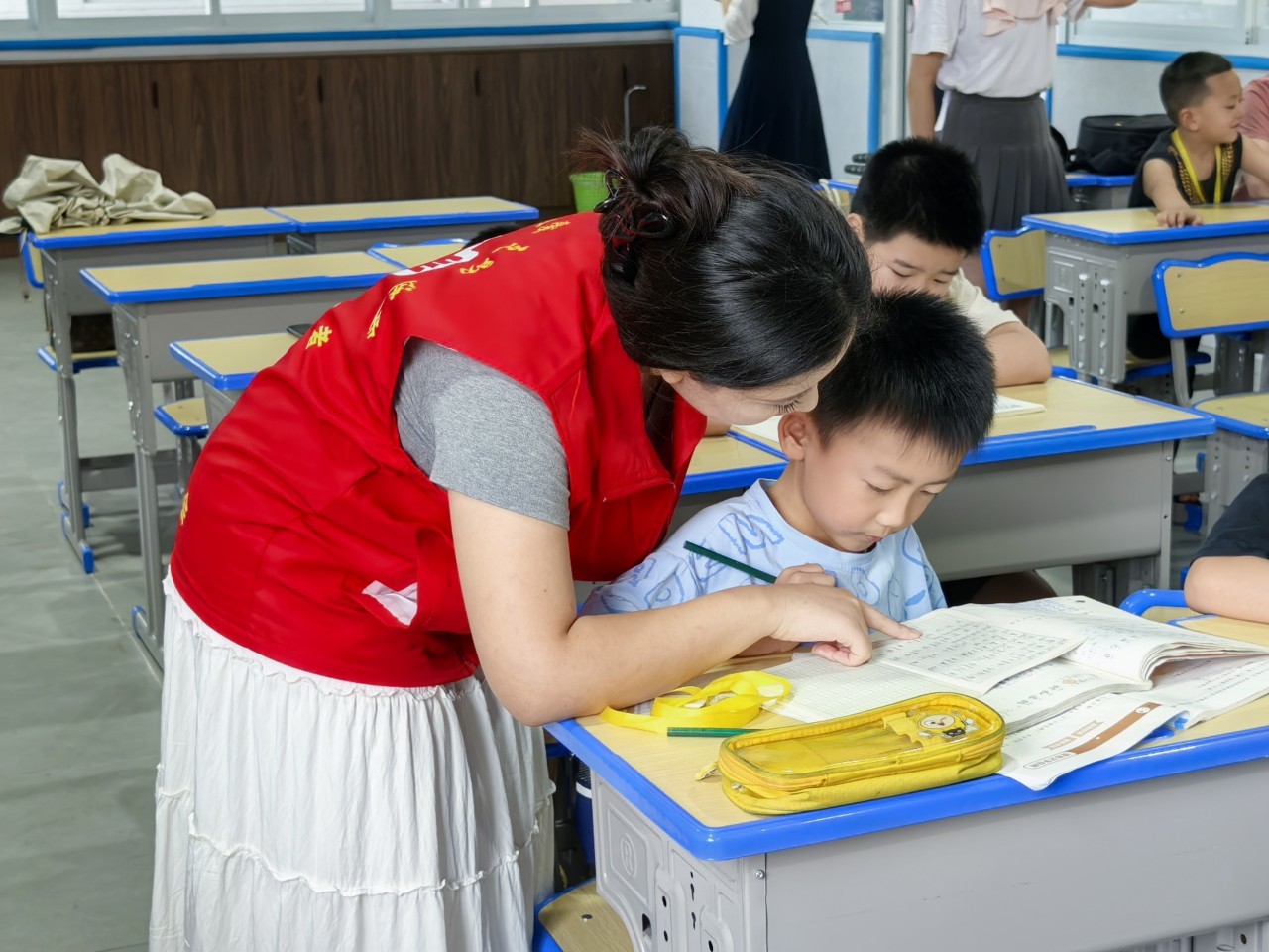 大学生志愿者给学生辅导作业。