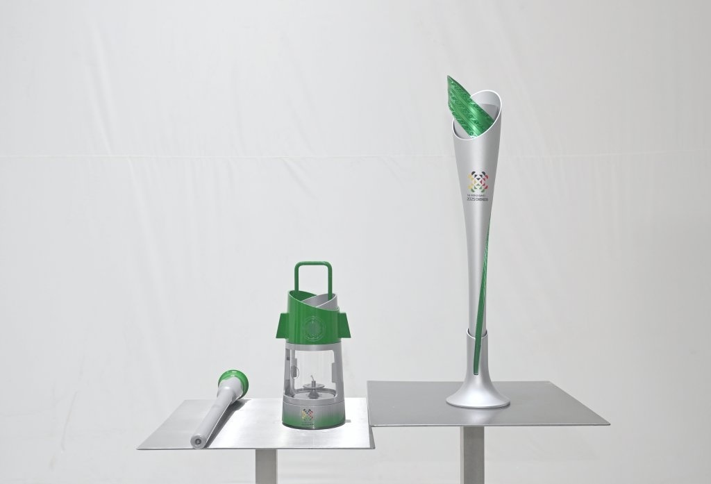 ▷7月16日,成都世运会火炬传递系列装置(火炬“竹梦”、火种灯、采火棒、采火器、火种盆等)亮相。