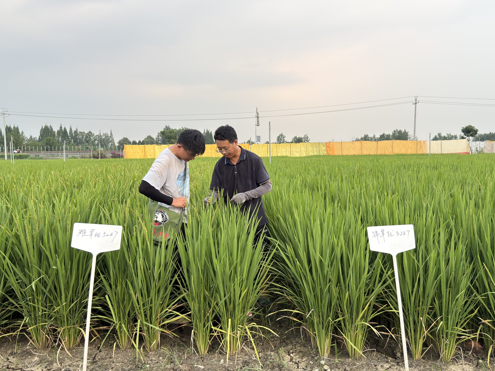7 月 16 日,李德强(右)在位于崇州的四川农业大学现代农业研发基地观察节水抗旱稻籽粒发育情况。