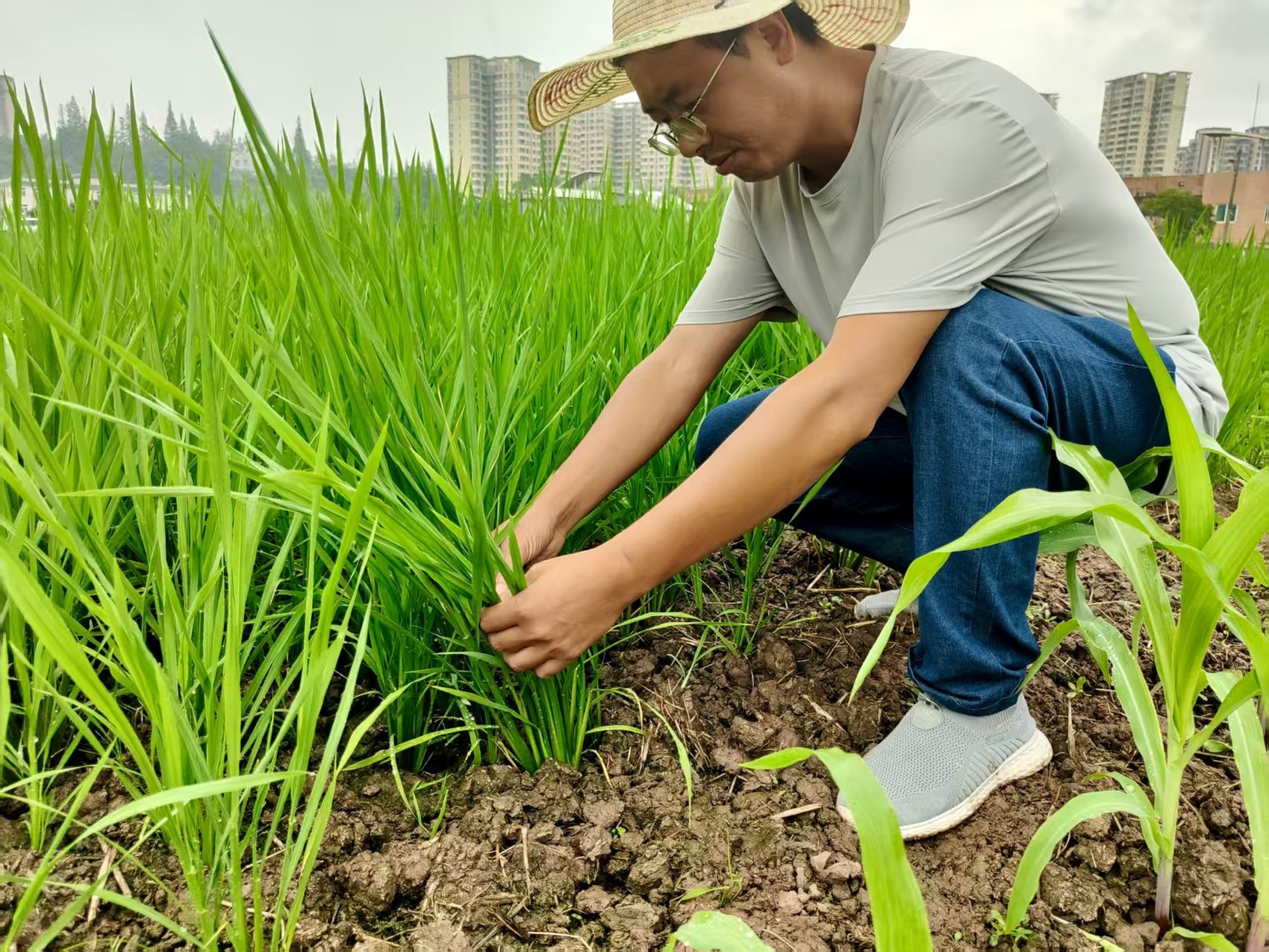 6月23日,李德强在观察节水抗旱稻材料。