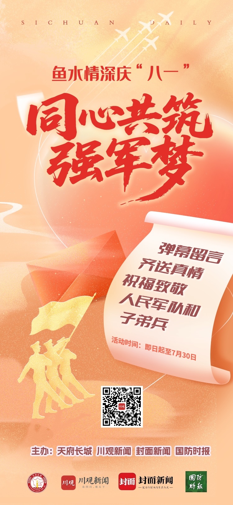 建军节来临之际,四川省军区“天府长城”融媒体联合川观新闻、封面新闻、国防时报三家省级媒体,发起“八一”祝福征集活动,邀您向人民军队和子弟兵送上节日祝福。