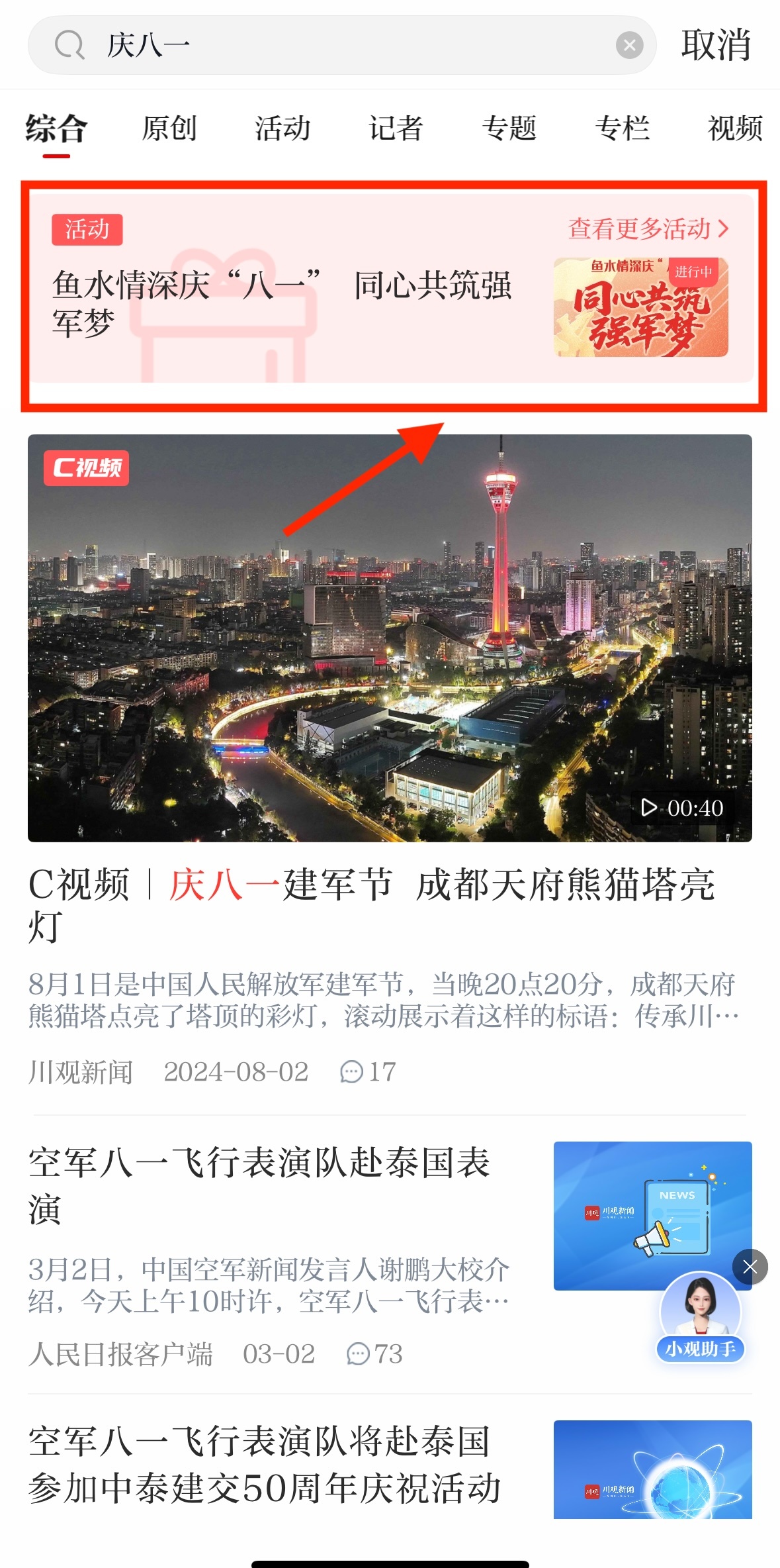 入口三:在川观新闻首页顶部搜索框输入:“庆八一”,点击活动链接即可参与。