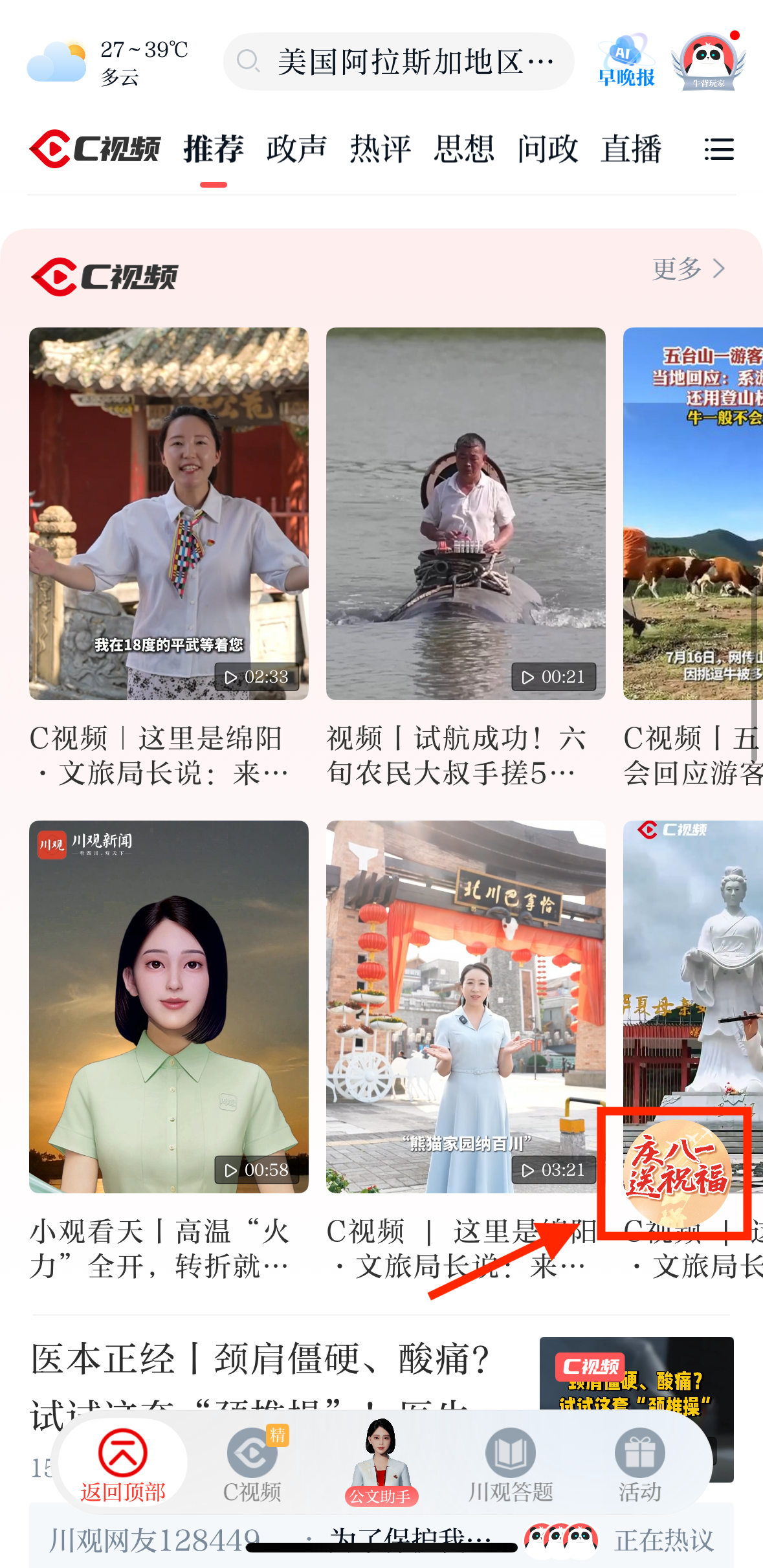 入口一:在川观新闻首页,点击右下方悬浮球,找到“鱼水情深庆‘八一’ 同心共筑强军梦”活动图片点击即可参与;