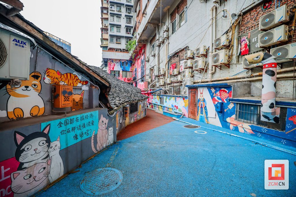一个月后,旧貌换新颜:300多只形态各异的猫咪“爬”满了巷道墙壁、管道、空调外机甚至电表箱,伴以丰富的本地文化标识和潮流图案,绘制的热情延伸至居民楼道甚至楼顶。据统计,“猫猫巷”创作范围超过500米,画面覆盖3000余平方米,其中不乏两层楼高的巨型猫咪。