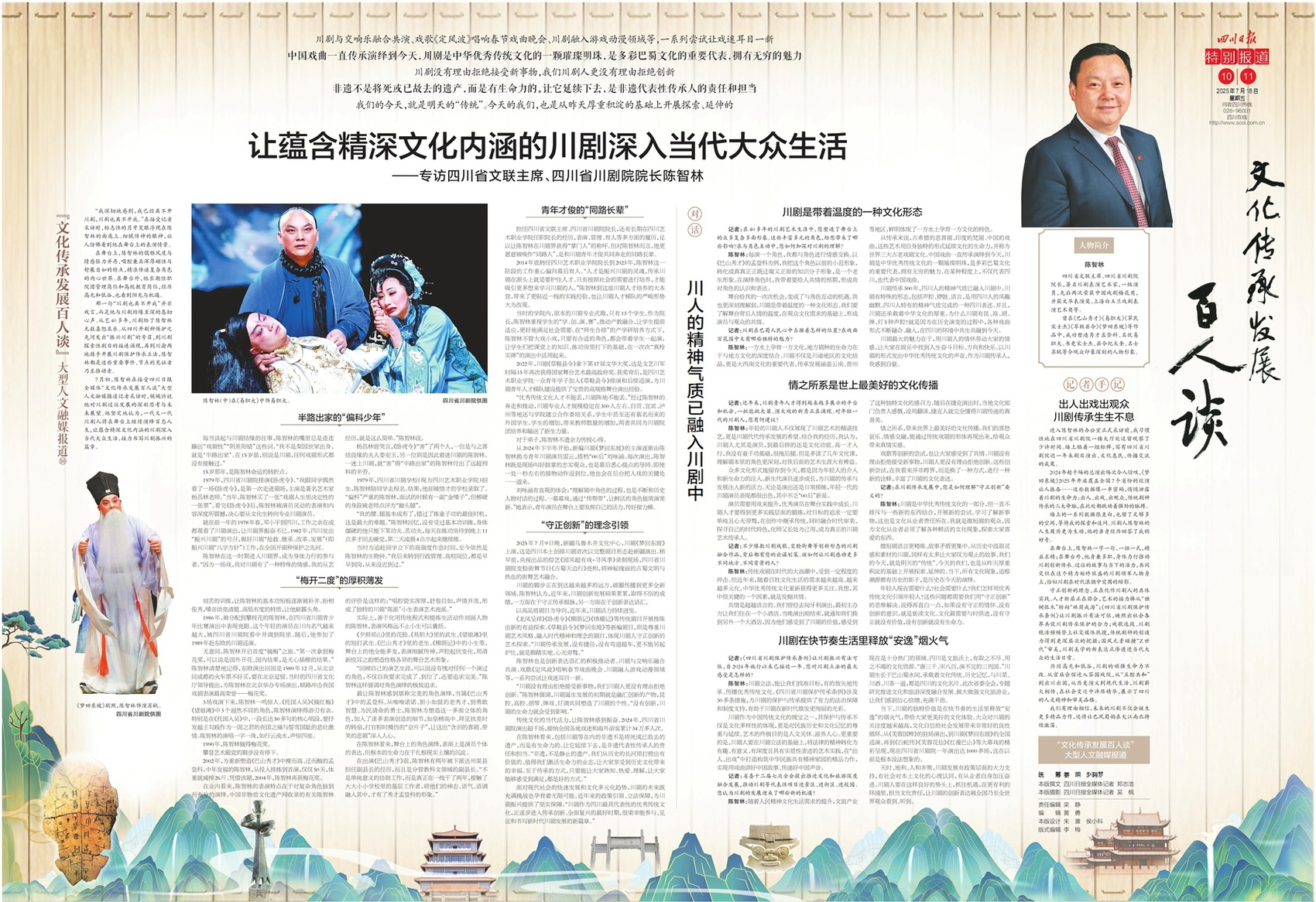 四川日报全媒体“文化传承发展百人谈”大型人文融媒报道持续推出,今日《四川日报》连版推出第九十期,专访四川省文联主席、四川省川剧院院长陈智林。