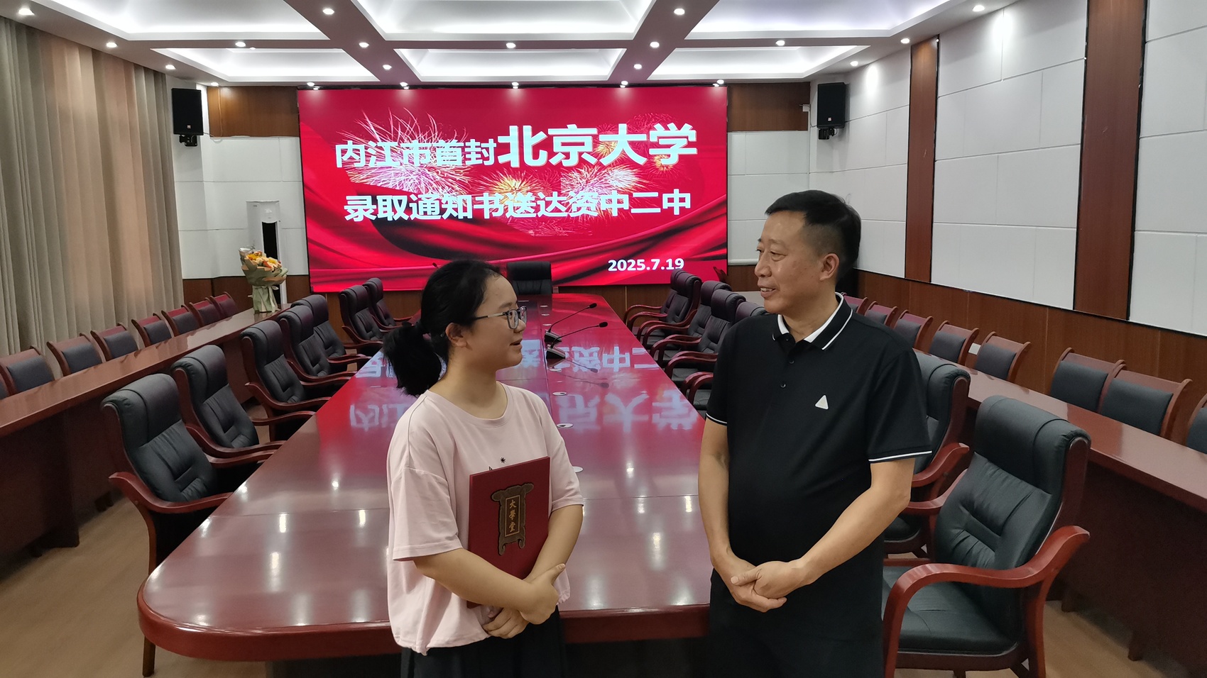 7月19日上午,内江市2025年首封北京大学录取通知书抵达资中县第二中学。该校历史类考生彭润以663分的优异成绩,斩获全市高考历史类第一名、全省第31名的佼佼者,通过北京大学强基计划被该校历史学专业录取。