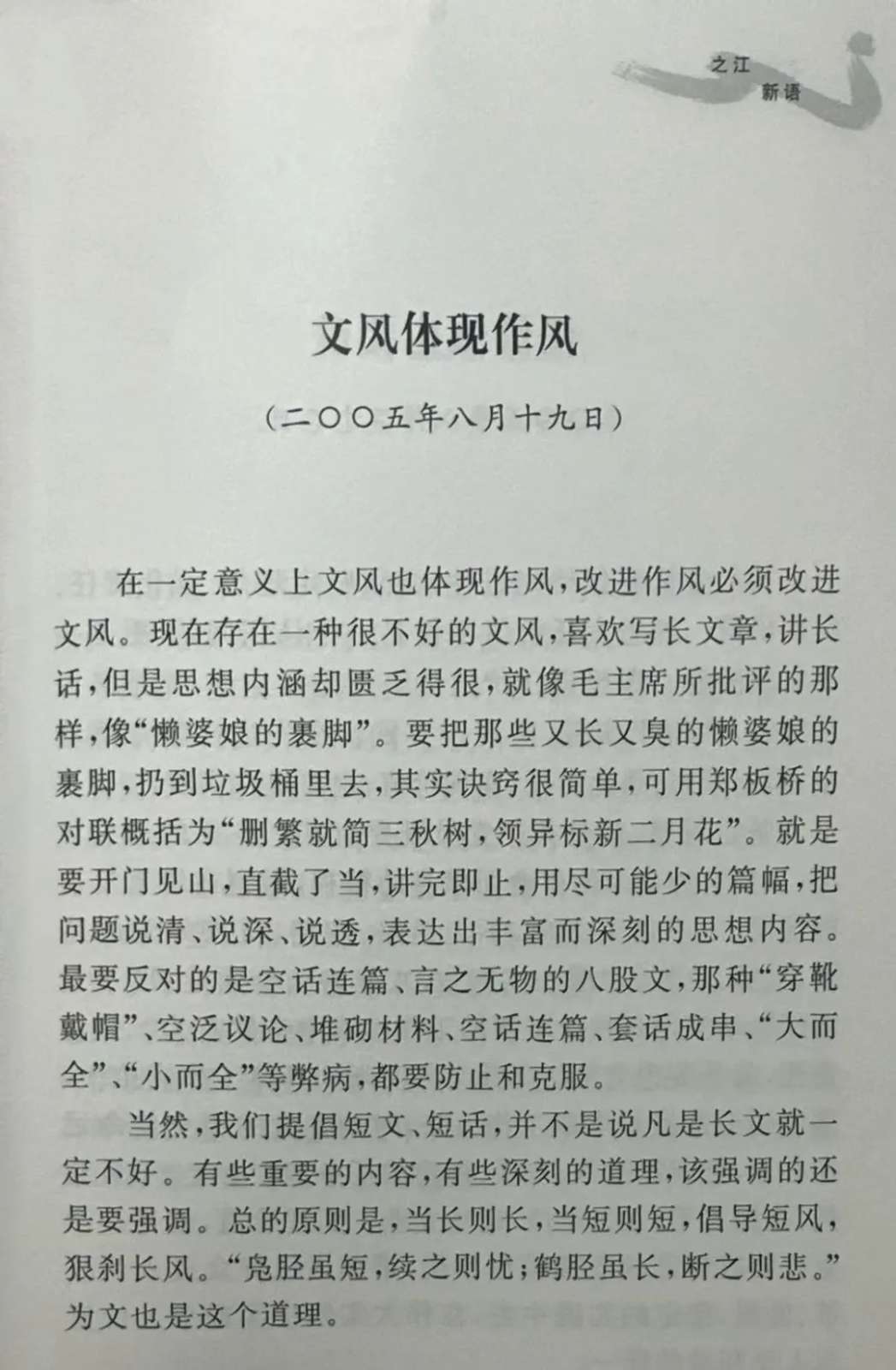 2005年8月19日,《浙江日报》“之江新语”专栏刊登了一篇题为《文风体现作风》的短论,作者是时任浙江省委书记习近平。