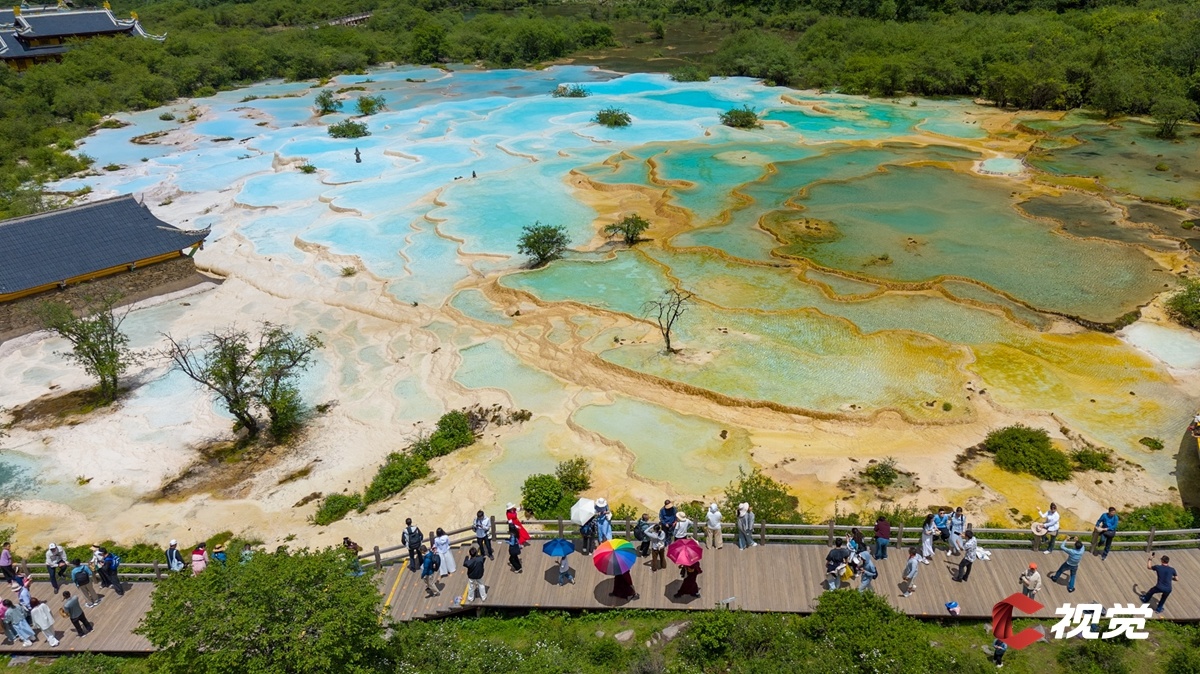 7月12日,阿坝州松潘县黄龙景区风景如画,国内外各地游客前来拍照游玩,游览美好夏日风光。C视觉签约摄影师 翁光建 摄
