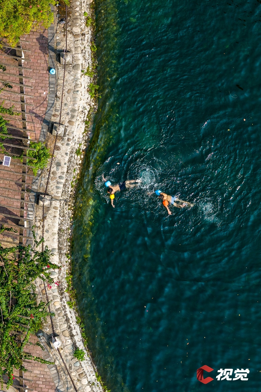 7月10日,彭州市九尺镇因泉眼众多,吸引不少市民前去游泳度夏。图为市民在该镇著名的双泉池里游泳。C视觉签约摄影师 张勇 摄