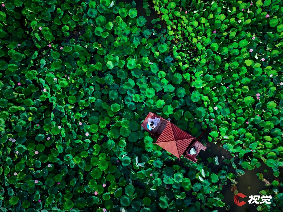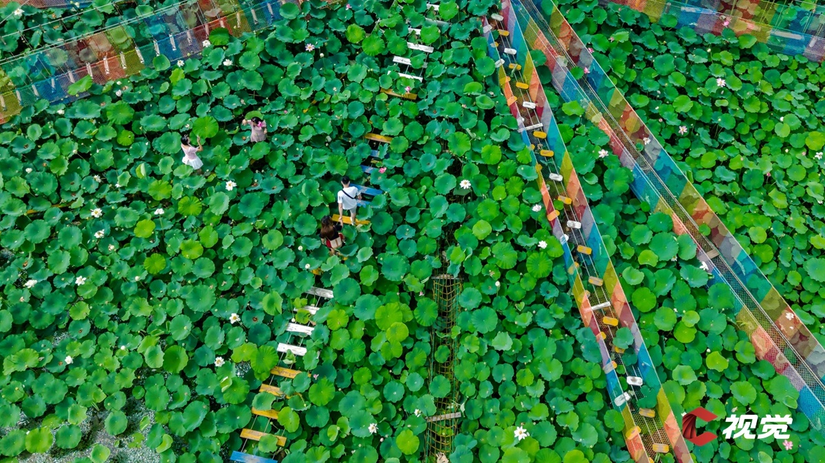 7月5日,资阳市安岳县文化镇隆恩村悦缘花谷乡村特色休闲区,游客在荷花丛中游玩享清凉。C视觉签约摄影师 杨康忠 摄