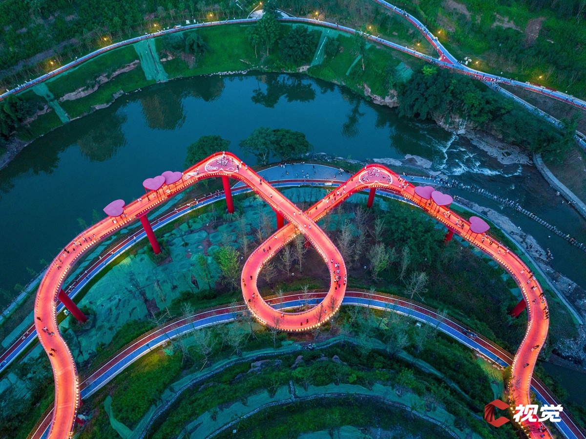 7月2日傍晚,广安市广安区西溪峡公园绚烂绽放,双心栈道勾勒出浪漫轮廓,吸引市民前来纳凉游玩。C视觉签约摄影师 张国盛 摄