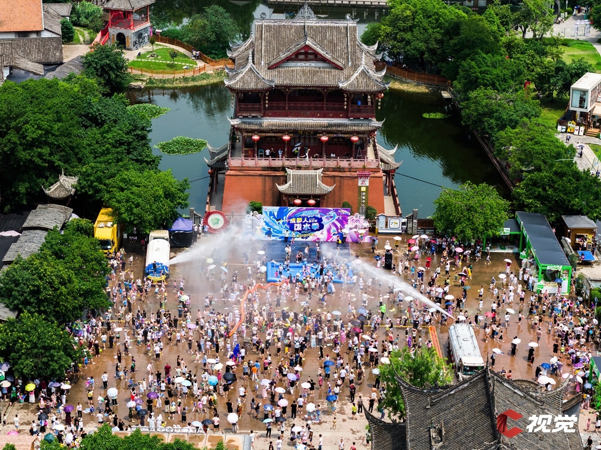 6月28日,成都人的泼水节——龙泉驿区洛带古镇水龙季吸引众多游人欢聚在广场上享受“玩水”乐趣。C视觉签约摄影师 董志刚 摄