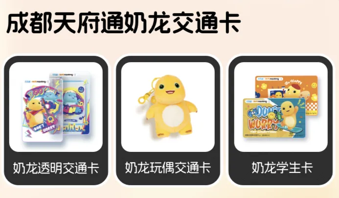 近年来,天府通卡不断加强与经典IP的联动,推出Hello Kitty、蜡笔小新、麦兜、海贼王、蜘蛛侠、钢铁侠等系列卡片。此次发售的天府通奶龙透明卡、玩偶卡及学生卡,从设计到权益都为各年龄段量身定制,市民持卡不仅可乘坐成都公交、地铁,还能享受实体天府通卡同等票价优惠。