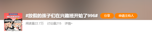 今天,“放假的孩子们在兴趣班开始了996”话题引发关注。有网友表示,有些“兴趣班”,打着“潜能开发”“训练领导力”的旗号,课程设计玄而又玄,教学内容空洞、重复、低效,孩子学得迷糊,家长看得心堵。