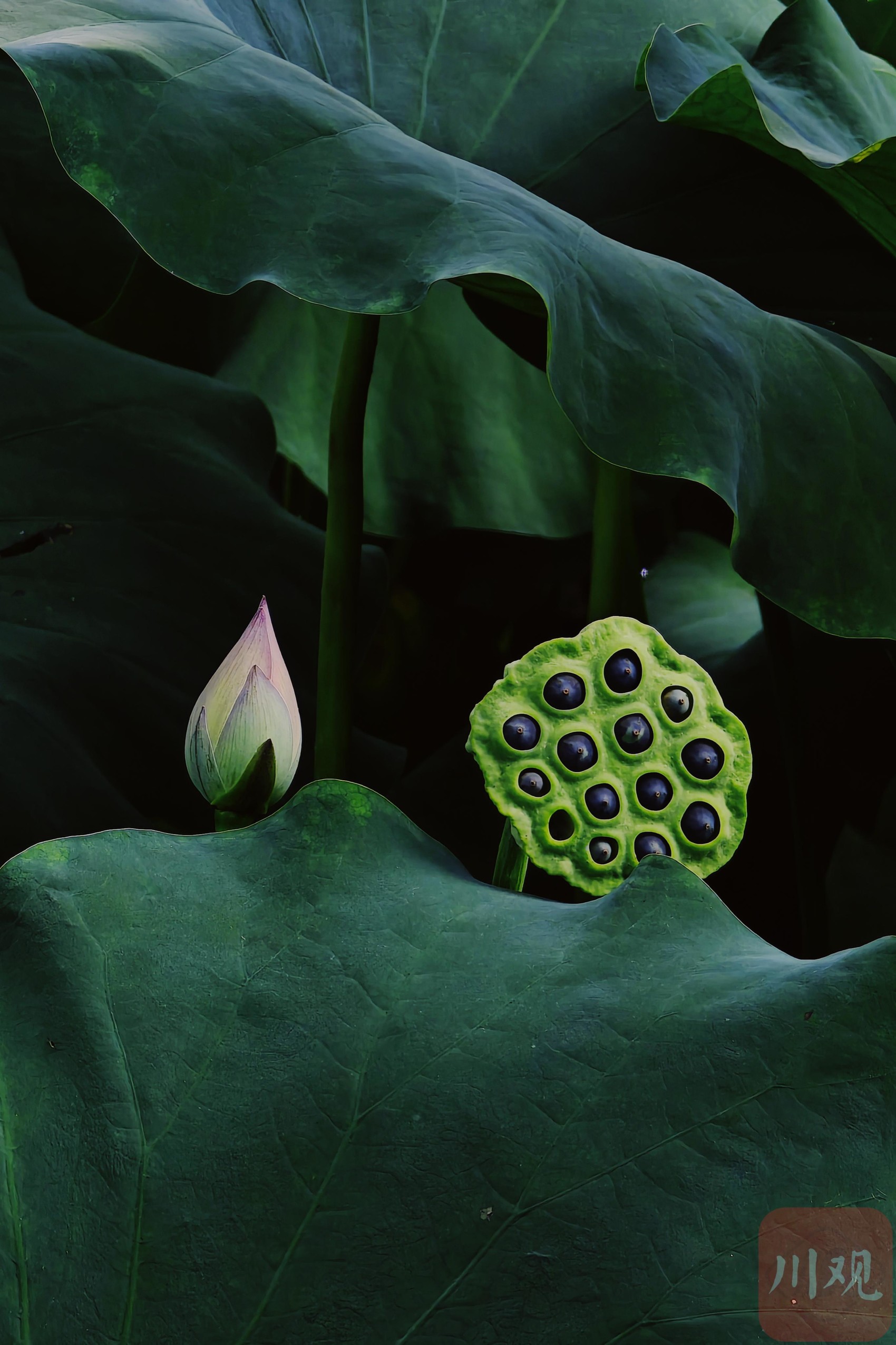荷花池中即将盛开的荷花与莲蓬。