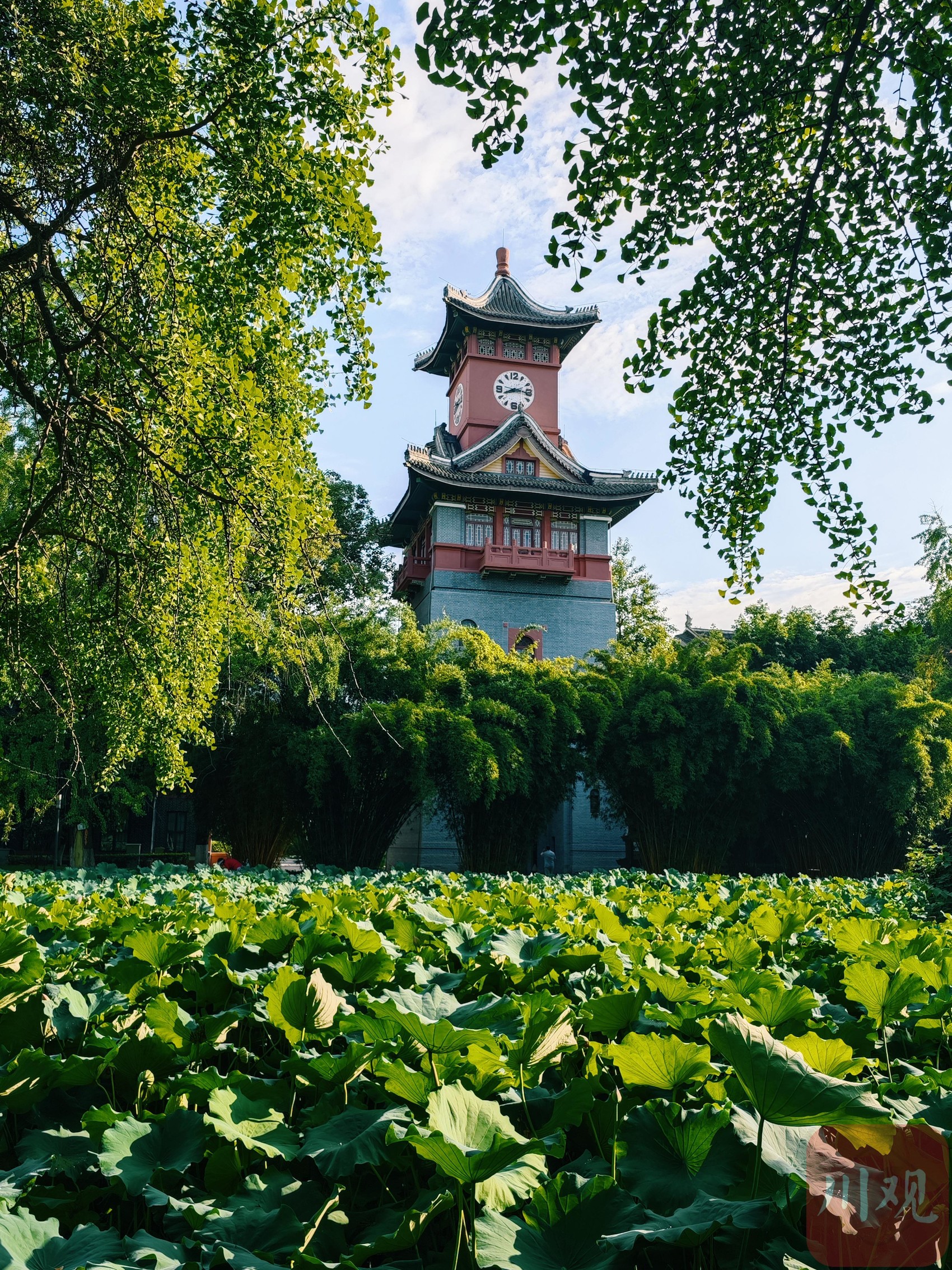 7月21日清晨,阳光洒落川大华西校区的荷花池。满池荷叶瞬间立体起来,晕染出更多层次的色彩,为盛夏添了几分清凉。