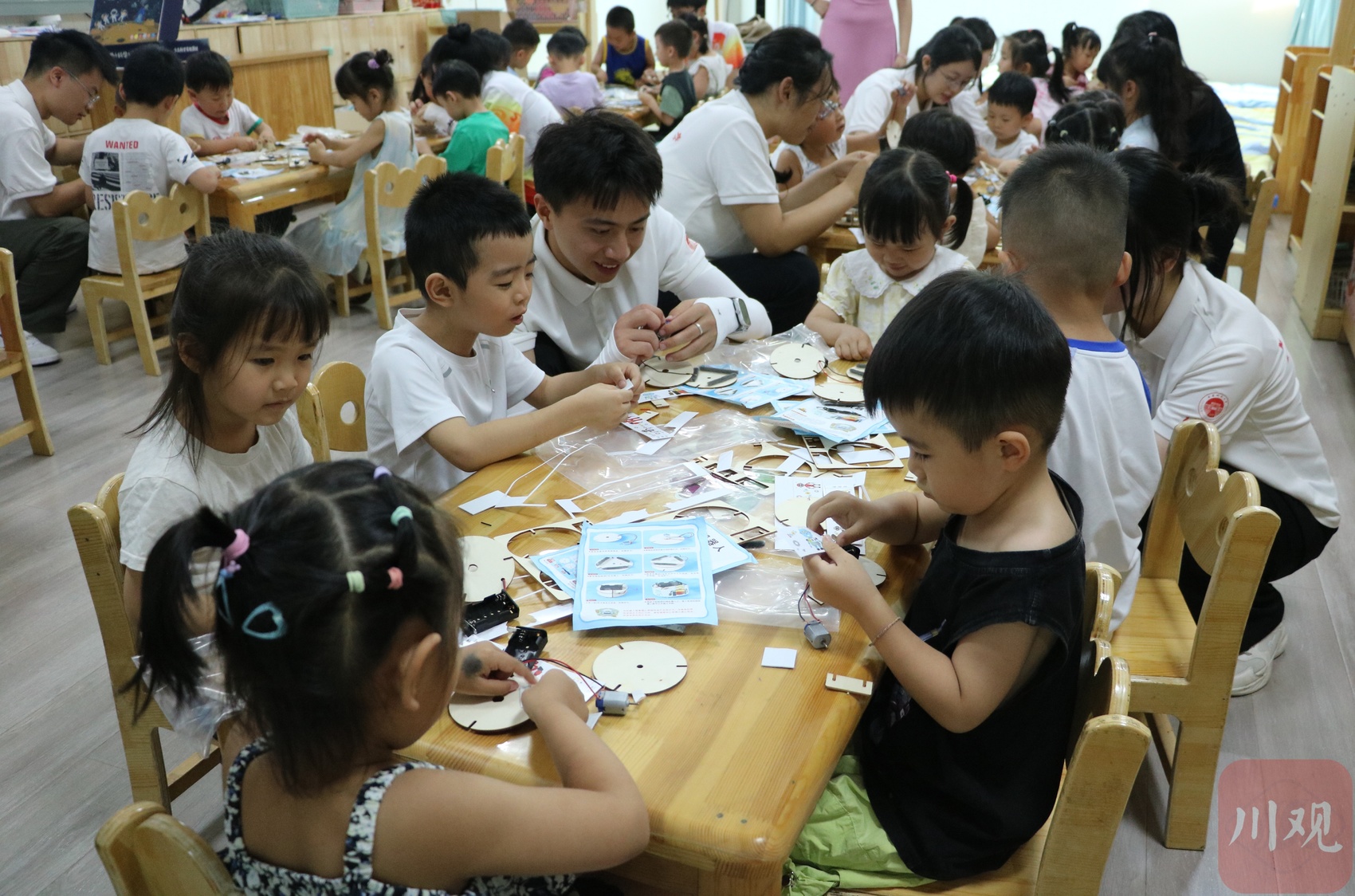 在凉山州西昌市河东幼儿园,小朋友们在西华师范大学大学生的带领下进行科学实验手工制作。