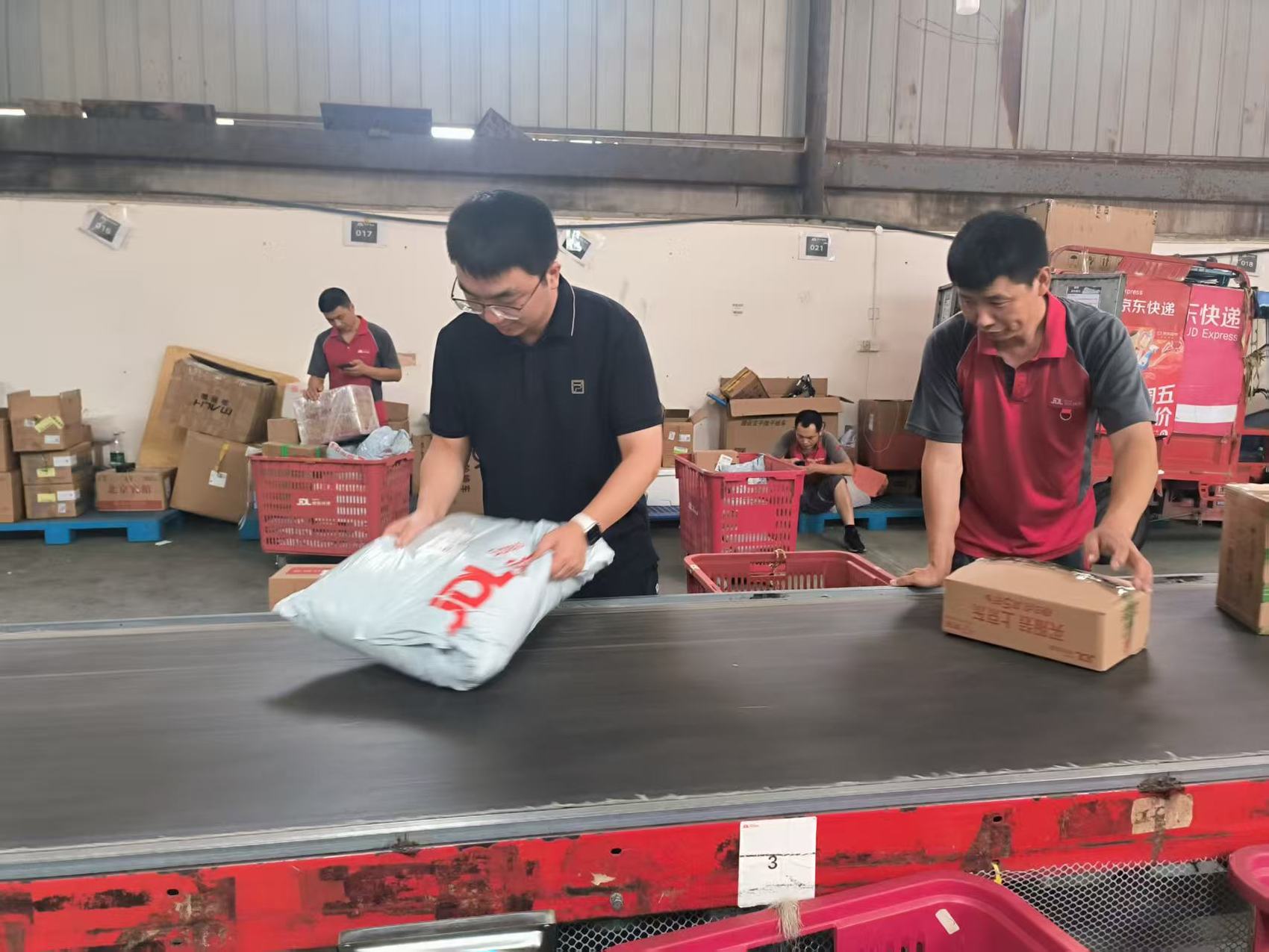 德阳市委组织部体验小组成员与快递小哥一起分拣快递包裹。胡善宁 摄