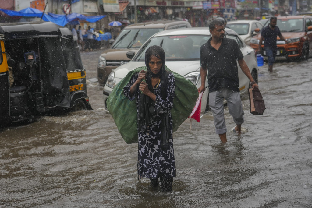 7月21日,人们在印度孟买的街道上涉水通行。