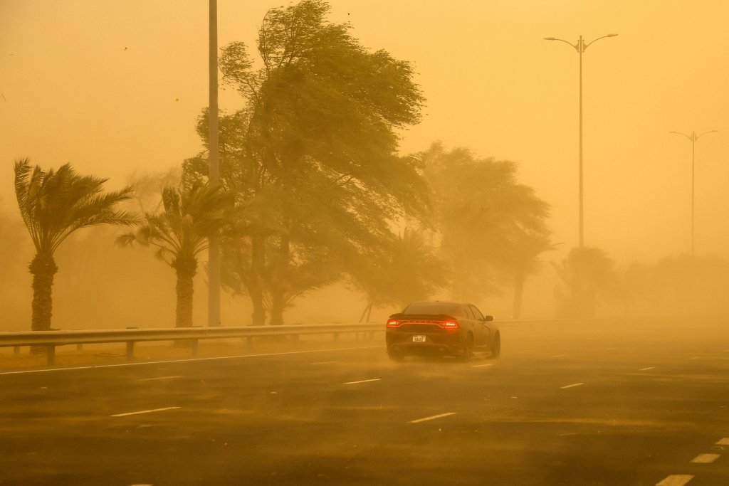 7月20日,在阿联酋首都阿布扎比,车辆在沙尘中行驶。