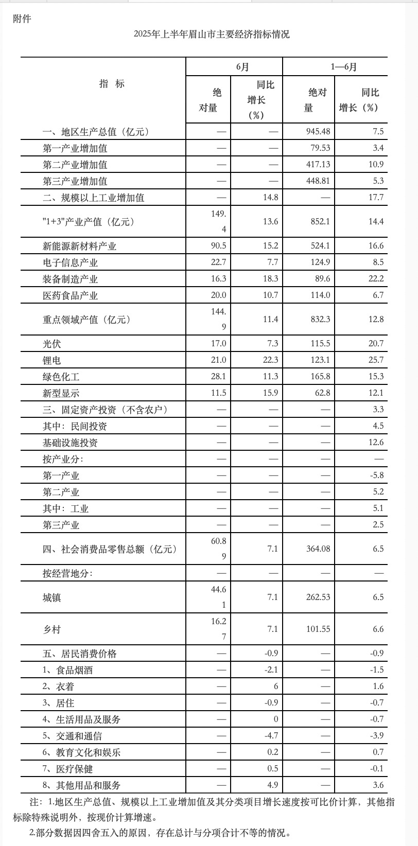 7月21日,记者从眉山市统计局获悉,上半年全市经济运行保持平稳有序。根据市(州)地区生产总值统一核算初步结果,2025年上半年眉山市地区生产总值(GDP)945.48亿元,同比增长7.5%。