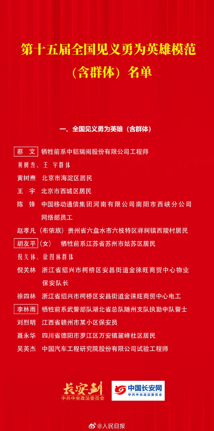 第十五届全国见义勇为英雄模范表彰大会7月21日在京召开,8名个人和2个群体获“全国见义勇为英雄”称号,40名个人和10个群体获“全国见义勇为模范”称号。具体名单如下↓