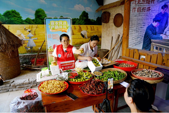这是省地质局驻宣汉县定点帮扶干部“云上助农”行动系列直播活动的第三场,135名驻村干部线上积极宣传,12名君塘镇及附近驻村干部参与农副产品的分类、称重、打包以及搬运等工作。