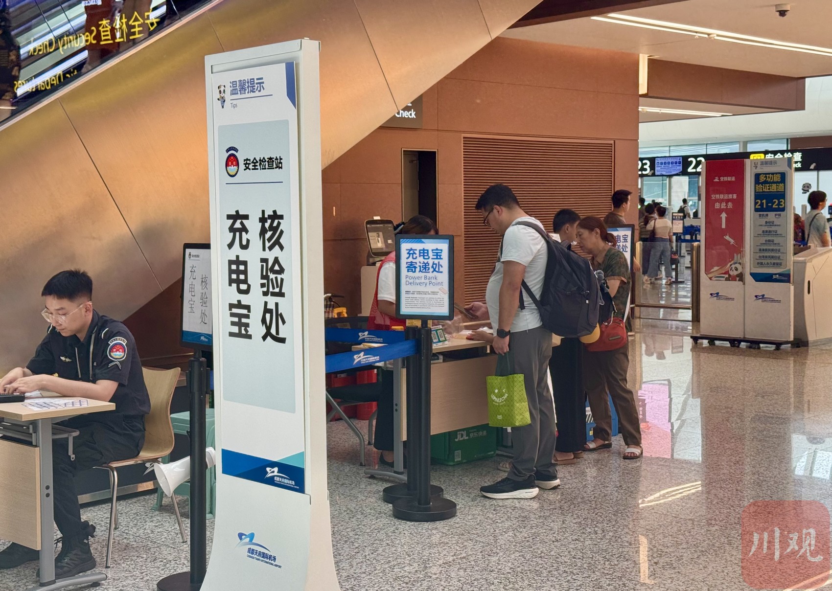 7月22日,记者来到成都天府机场实地探访,发现距离机场安检口不远处,设置了充电宝核验处,携带充电宝的旅客在此处排队为充电宝“安检”。在核验处后面,则设置了充电宝寄递处,专门寄递检验不合格的充电宝。旅客在自愿寄递的前提下,可以选择通过该寄递点寄出充电宝。
