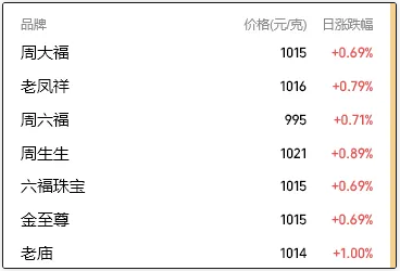 受此影响,国内金价同步回涨,多数国内金店金饰价格重返千元关口。金融投资报记者注意到,7月22日周大福足金首饰价格由昨日的1008元/克上调至1015元/克,周生生足金首饰价格由昨日的1012元/克上调至1021元/克。