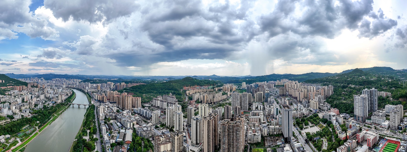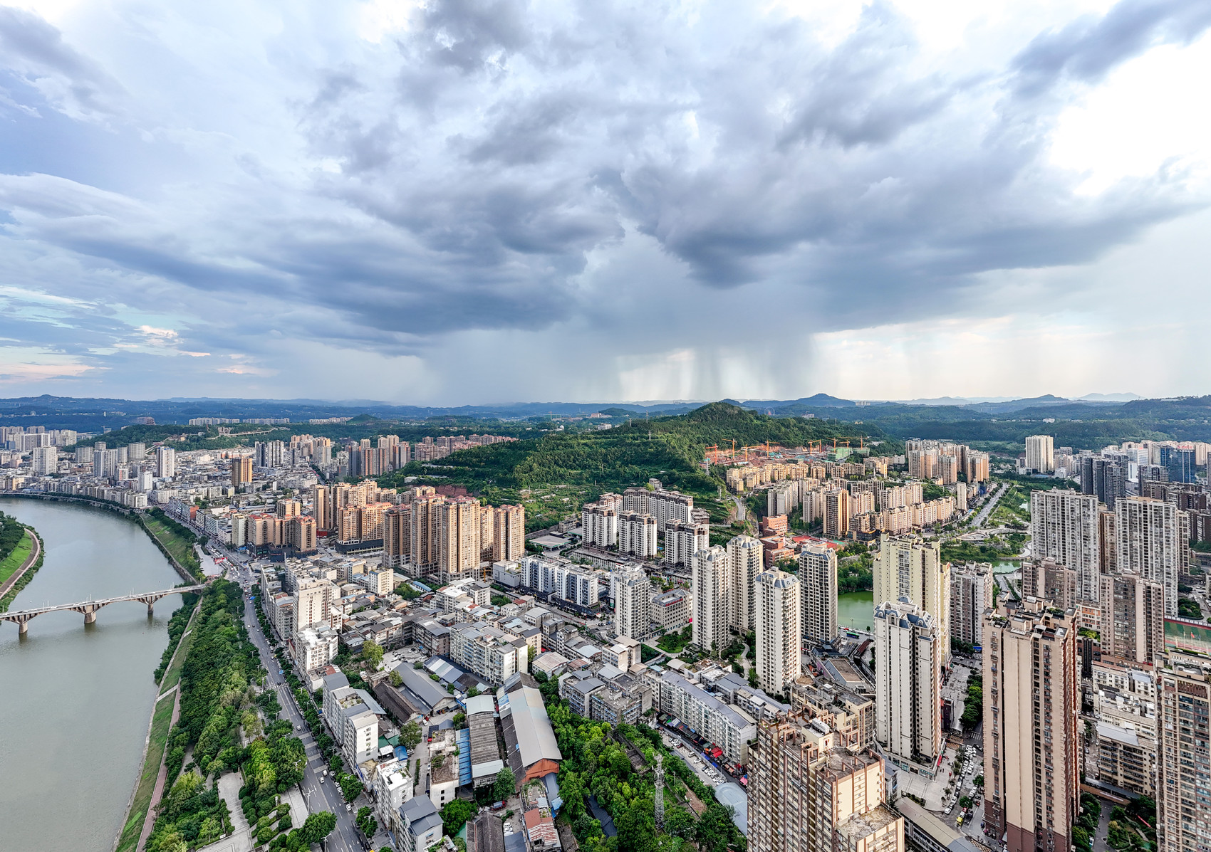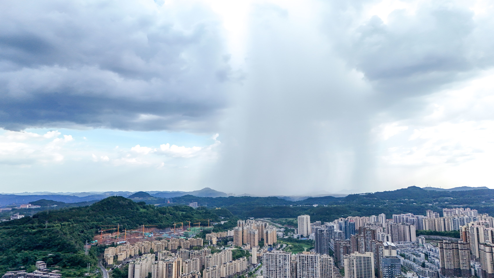 7月22日傍晚6时许,巴城上空出现“雨幡”奇观。从航拍视角可见浓厚的乌云中垂落数道明显的雨幕,如巨幅水带直挂而下,大雨倾盆的壮阔场景清晰呈现。