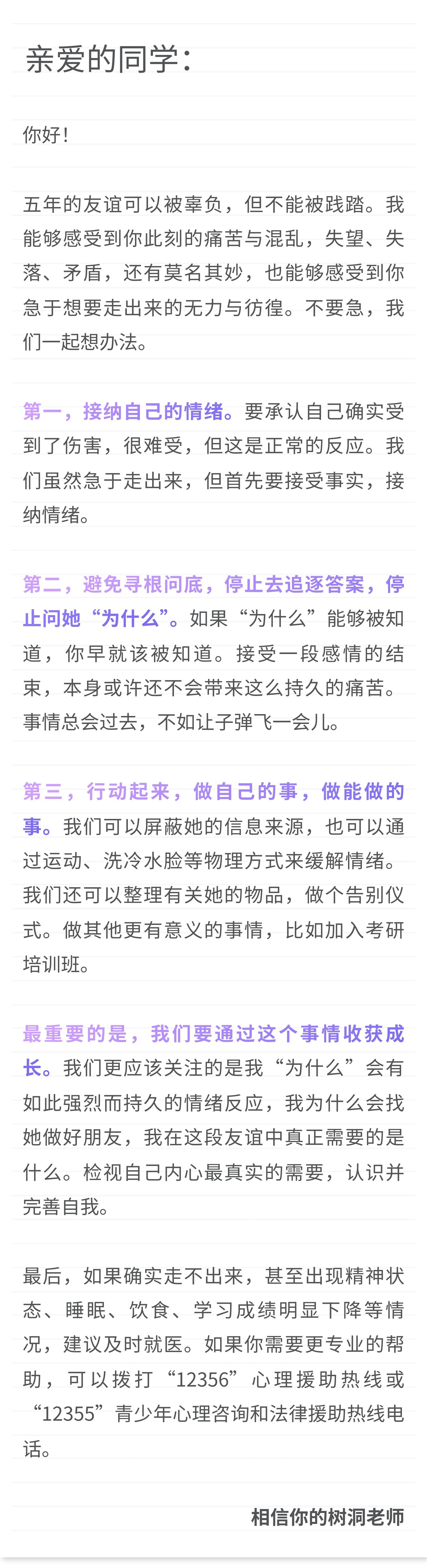 一位20岁大学女生:心里堵着一件事情,学习也学不进去,也不想干别的事情,也不知道怎么解决。和一个认识五年的朋友绝交了,然后她还在小红书上发帖子内涵我,还拉黑我的所有联系方式……不明不白被“绝交”。我要考研,但我的情绪掉在这个事情里面了,极度焦躁,学不进去。