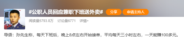 公职人员下班送外卖是什么体验?今日,话题“公职人员回应兼职下班送外卖”登上热搜。