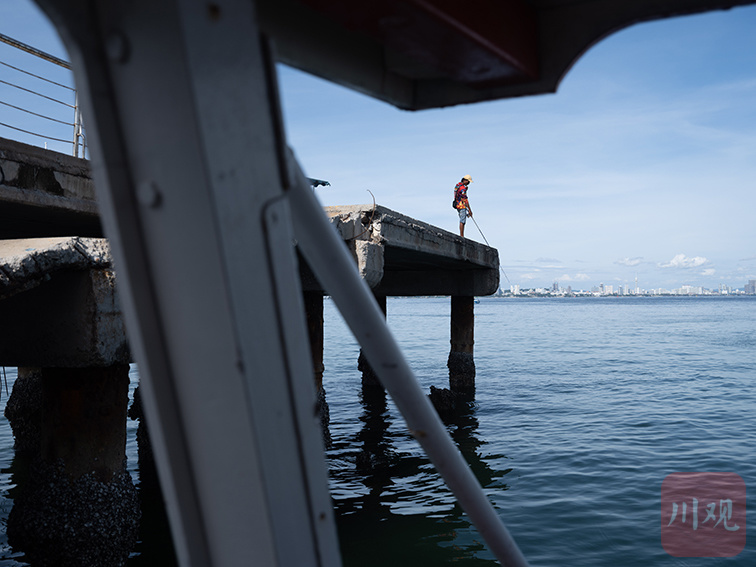 格兰岛上的码头附近海域鱼类丰富,一位钓鱼人脱离人群,独自垂钓。