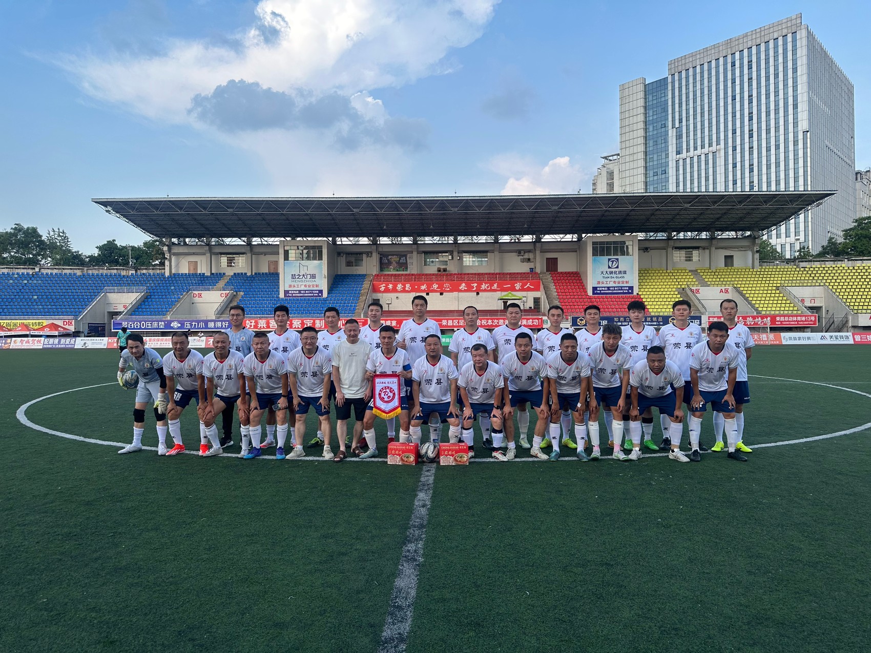 比赛结束后,双方足球队互赠特色礼品。荣县队员送上了包含冷吃鸡、麻辣鸡调料等在内的荣县特产礼包;荣昌队员回赠了当地名产“蜜蜜陈皮兔”与“鹅蛋卷”,以地道风物传递深厚情谊。