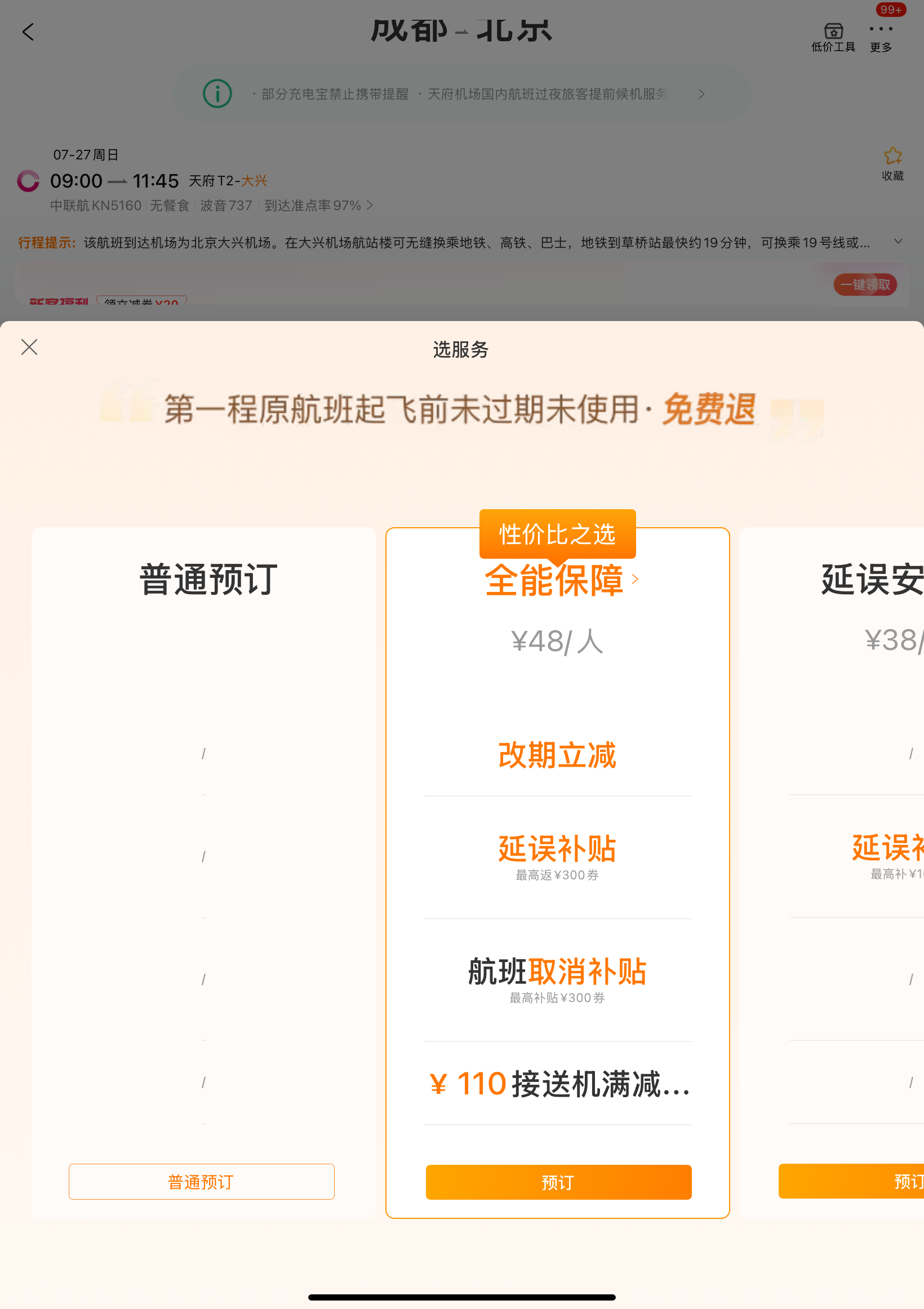 对比购买体验。在某三方平台点击预订机票,会给到用户“48元全能保障”的购买提示,如无此需求,则需要用户手动更改为“普通预订”,航旅纵横平台则没有类似提示。