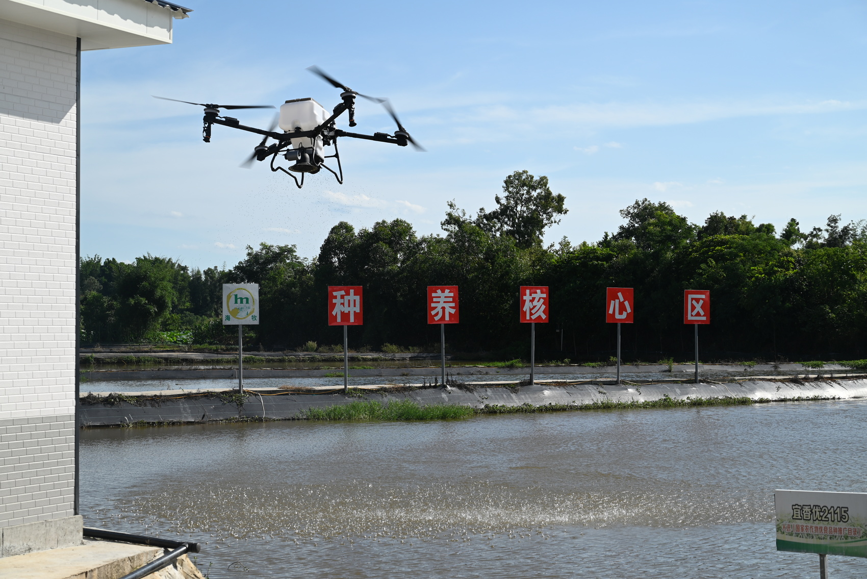 换电池、装饲料、按开关……桨叶“嗡嗡嗡”转动,一架搭载智能投喂系统的无人机腾空而起,飞抵稻虾田上空。按设定飞行高度以及喷洒时间和剂量,无人机将饲料均匀地投喂在稻虾田中。这是7月22日上午,泸州市泸县玄滩镇新山村稻虾养殖基地里发生的一幕。