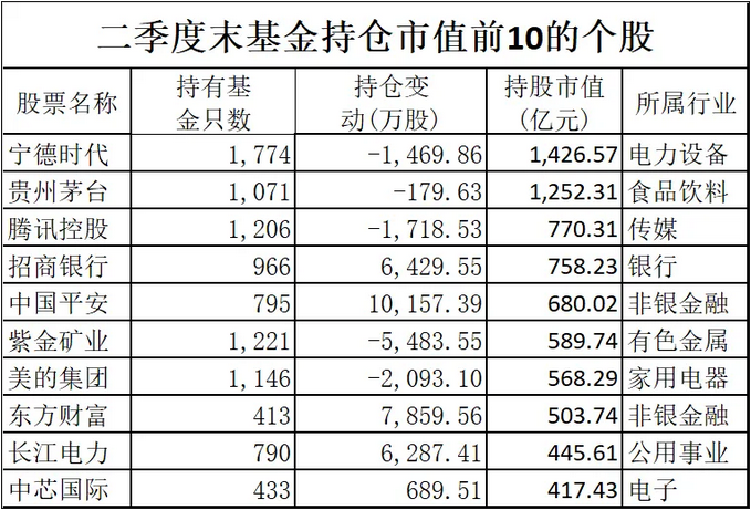 据Wind数据显示,以持仓市值计算,今年二季度末基金前十大重仓股变化不大,宁德时代、贵州茅台、腾讯控股、招商银行仍然稳居重仓股前4名之位,持仓市值分别为1427亿元、1252亿元、770亿元和758亿元,除招商银行外,其余3只股均有上千只基金重仓持有,不过相较之下,这3只个股的基金重仓数量较一季度末均有所减少。