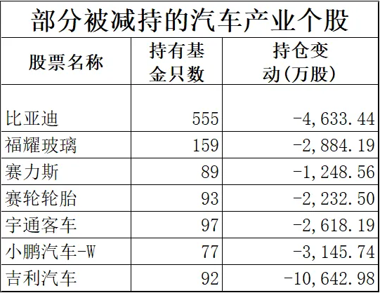 事实上不仅是比亚迪,汽车行业及产业链上的多只个股在第二季度也被明显减持,宇通客车二季度末的基金持股数为12687万股,较一季度末减少2618万股;港股小鹏汽车的基金持股数为4784万股,较一季度末减少3146万股,被大幅减持;港股吉利汽车的基金持股数为15788万股,较一季度末减少10643万股,减持幅度也较大;港股长城汽车持股数为15817万股,较一季度末减少5763万股。此外产业链上的福耀玻璃、赛力斯、赛轮轮胎等个股的基金持股数也较一季度末减少。