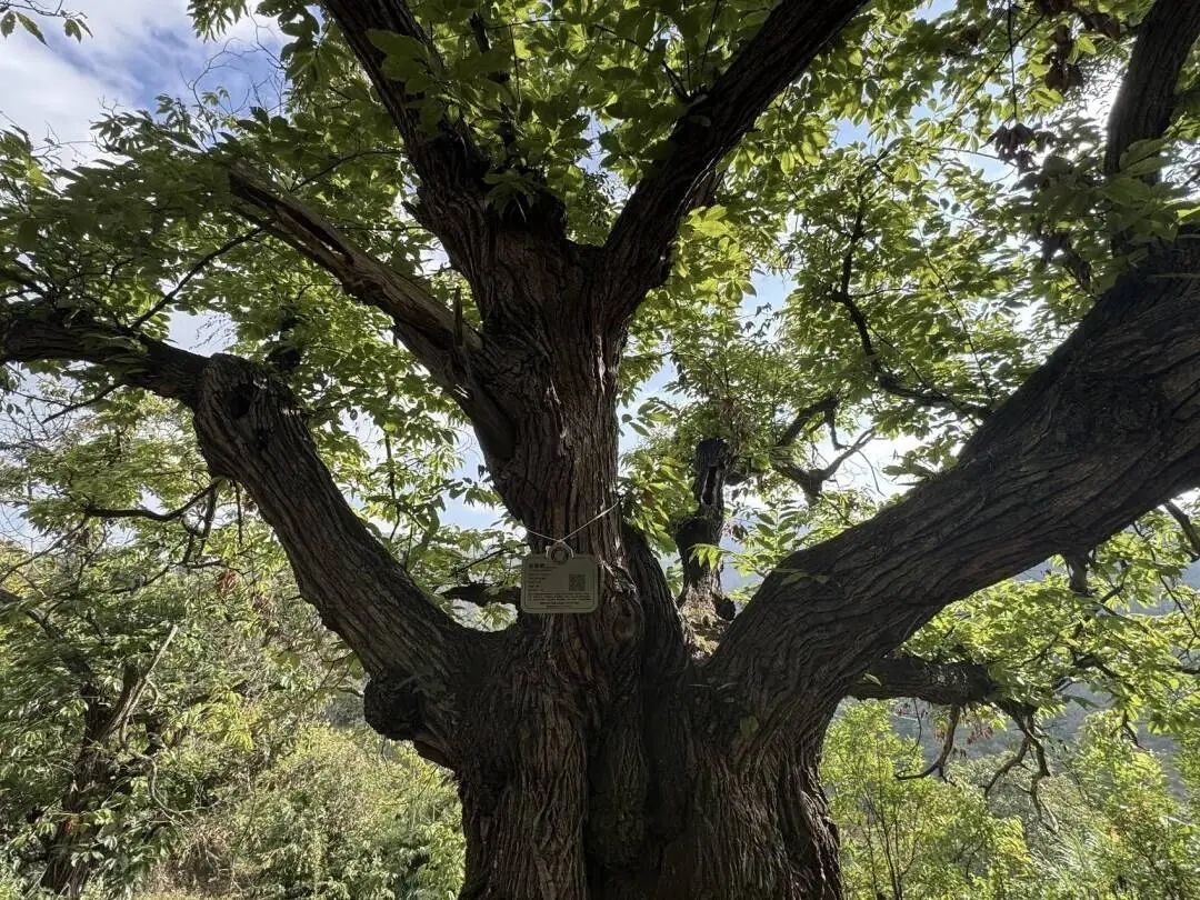 阳光下,百年古树静静伫立,郁郁葱葱。树龄最大的一棵古树身份证上写着:西南栗祖,树龄810年,树高10.5米,冠幅15.6米,胸围510厘米,二维码详细记录了养护时间和古树生长情况。微风拂过,树枝摇曳,仿佛穿越时空与世人对话。