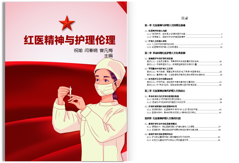 达州职业技术学院将红色素材深度融入教学,以“理论+案例+实践设计”为特色,提炼红医精神核心(如艰苦奋斗、无私奉献等)与护理伦理四原则的共通性,开发出《红医精神护理人文案例》《红医精神与护理伦理》等新形态教材。部分收录“卫生员王零兰用草药救重伤员”“赤脚军医张大山断粮期坚持救护”等经典故事,实践部分设计“模拟战地救护伦理决策”“红色基地研学”等活动,引导学生将红医精神转化为临床思维与职业操守。