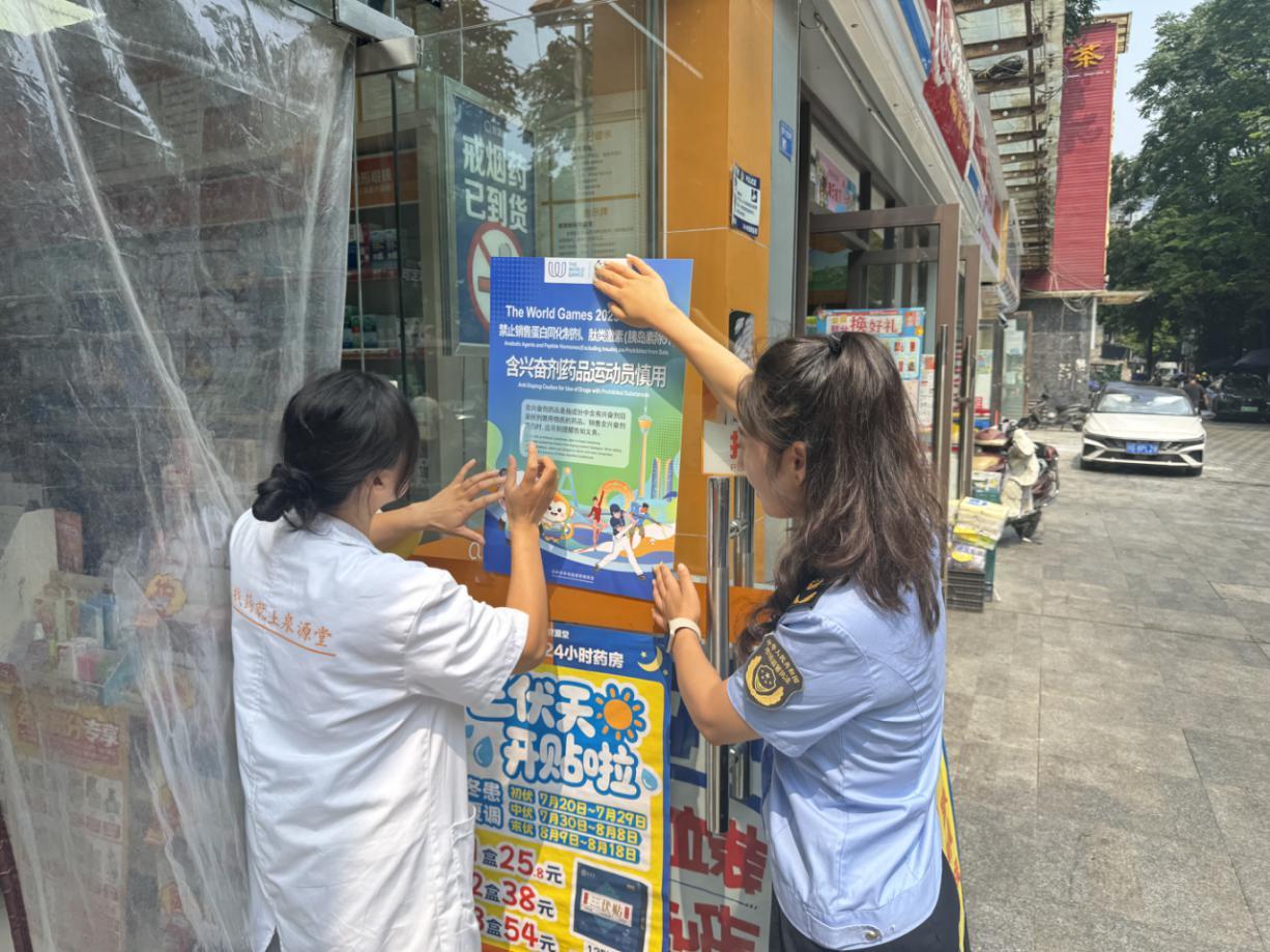 “海报展示、页面警示、主动告知、票据提示四个环节缺一不可。”在金堂县成都兴佳源堂大药房,执法人员通过“现场查验+线上倒查”方式开展监督检查,确保销售含兴奋剂药品时做到“四到位”落实。“四到位”即,店堂海报到位(醒目位置张贴);柜台/网售页面展示到位(药品陈列处或线上页面显著位置展示警示信息);销售主动告知到位(店员在销售时口头告知“运动员慎用”);小票/网络订单提示到位(交易凭证上明确标注“运动员慎用”字样)。