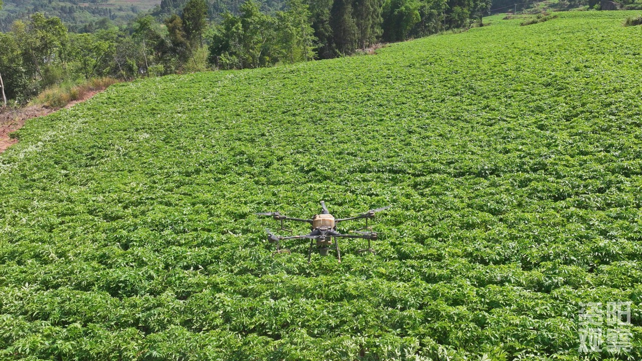 园区内植保无人机飞防作业。潘政吉 摄